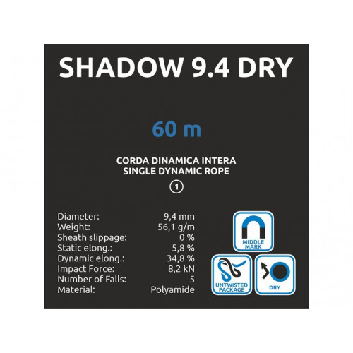 C.A.M.P. Shadow je horolezecké dynamické lano s průměrem 9,4 mm a impregnací opletu DRY. Shadow je ideálním partnerem pro nejširší nabídku horolezeckých disciplín. Se svým průměrem 9,4 mm nabízí krom perfektního handlingu také nízkou hmotnost a dobře se ovládá jak v klasickém kyblíku ( např. C.A.M.P. PIÚ 2) tak i v poloautomatickém jistítku třeba i s anti-panic brzdou jako je C.A.M.P. Matik.